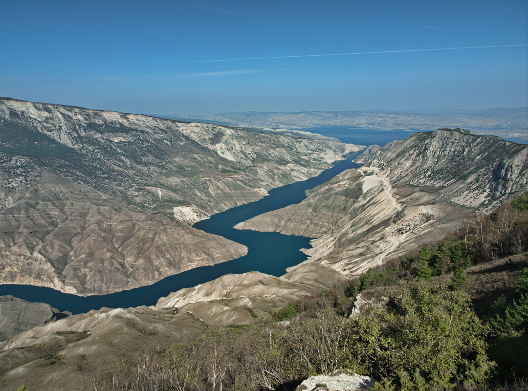 Чиркейское водохранилище. В завершении тура заедем еще на одну смотровую: отсюда открывается впечатляющий вид на самую высокую арочную плотину России. Чиркейская ГЭС с 200-метровой аркой, зажатой в ущелье реки Сулак, поражает мощью и размахом совместной работы природы и человека.