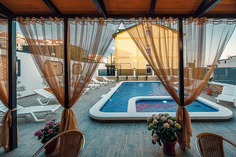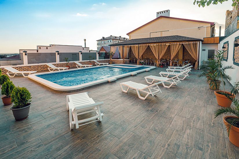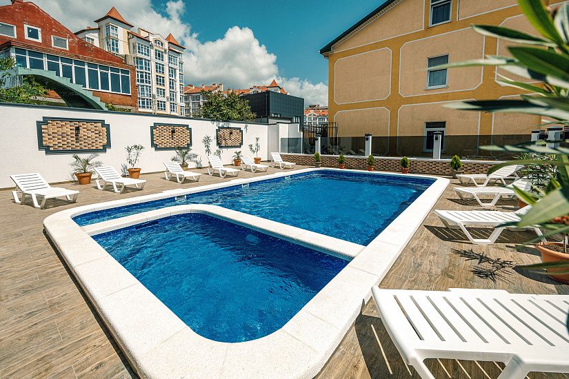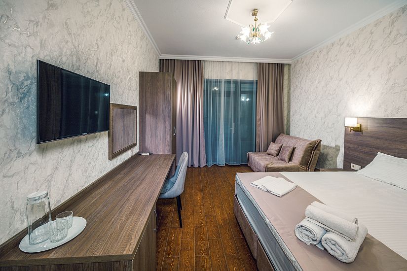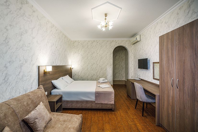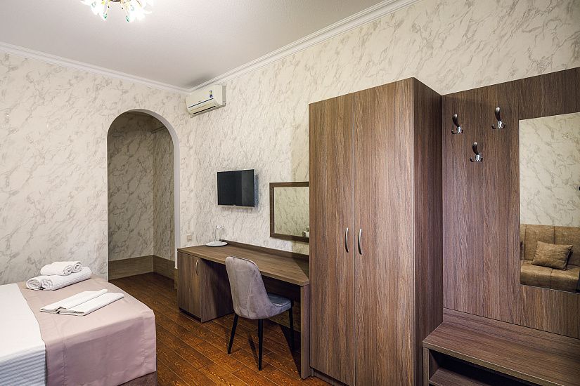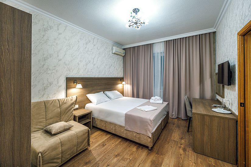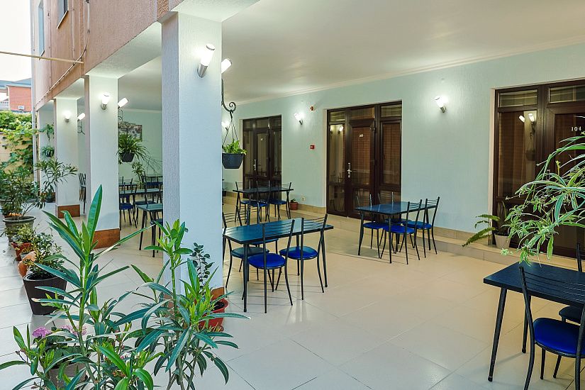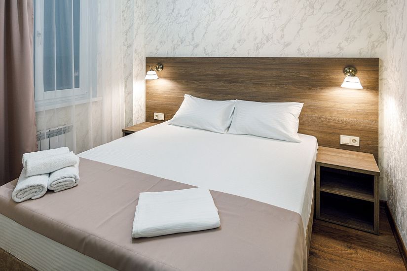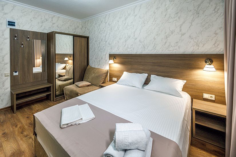 комфортные 2-х, 3-х местные однокомнатные номера, и двухкомнатные 4-х местные номера с удобствами (душ, умывальник, туалет), телевизор, холодильник, кондиционер, Wi-Fi. Удобные ортопедические матрасы, белоснежное постельное белье.