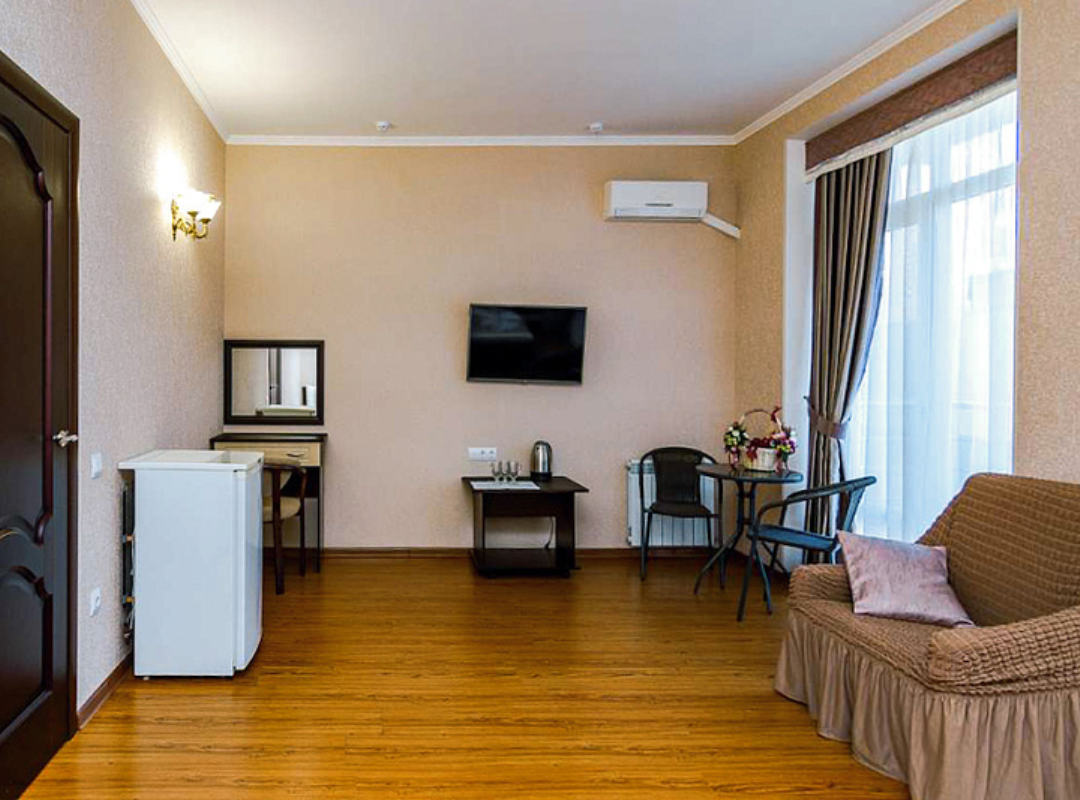 Комфортабельные 2-х местные номера 20 кв.м (двуспальная кровать) и студио 40 кв.м для 3-х местного и 4-х местного размещения с удобствами, холодильником, ЖК телевизором со спутниковым ТВ, кондиционером, чайником. Возможно дополнительное место и детская кроватка. В каждом номере балкон оборудован столиками и креслами для отдыха.