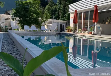 Гостевой дом расположен недалеко от центра курорта Небуг. Гостям предлагается 19 комфортабельных номеров разных категорий. Закрытая территория обеспечивает приватную атмосферу отдыха, безопасности и уединения. Основным акцентом на территории является бассейн с подсветкой, подогревом с детской зоной размером 15м х 6м.Гостям предоставляются шезлонги, зонтики и пляжные полотенца. Для юных гостей предусмотрена детская площадка и батут. Любителям спорта предлагается турник, брусья и настольный теннис.