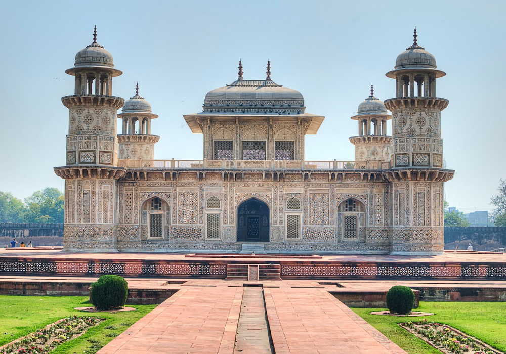 Далее посетим Итимад-уд-Даулу — небольшую элегантную парковую усыпальницу, построенную в 1622 г. В гробнице сочетаются белый мрамор, цветная мозаика, каменная инкрустация и решетки. Из примечательного: это наиболее новаторское могольское сооружение XV в.