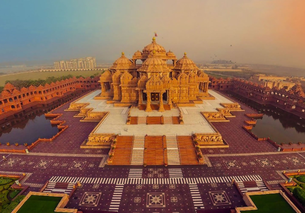 Храм Акшардхам — современный храмовый комплекс в танцующими фонтанами, скульптурами, каналами и аллеей, рассказывающей о важных событиях и великих людях Индии. Храм настолько грандиозный (поразительный в плане архитектуры и искусства), что даже вошел в Книгу Рекордов Гиннеса.