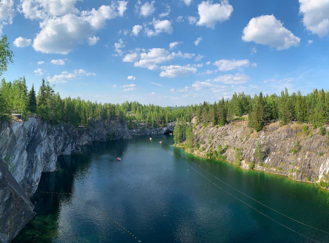 Посещение мраморного каньона Рускеала. Вас ждет пешеходная прогулка по парку: отвесные берега мраморных озер с прозрачной водой в красивейшей чаше из рускеальского мрамора с оборудованными смотровыми площадками и глубокие штольни не оставят никого равнодушными (вх. билеты за доп.плату - 750 рос. руб.).