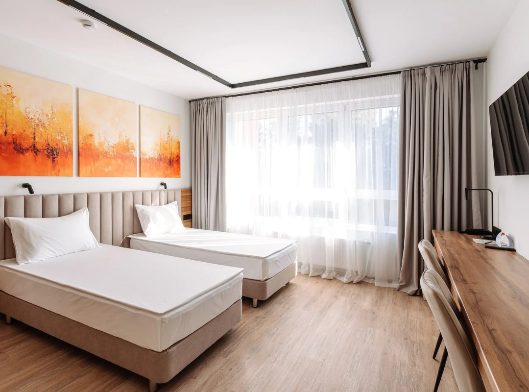 В номерах есть всё необходимое для комфортного отдыха: удобные модульные кровати, вместительный шкаф, рабочая зона, большая ТВ-панель, кондиционер, Wi-Fi, утюг с гладильной доской и сейф, оборудованная кухня, ванная комната с душевой зоной.