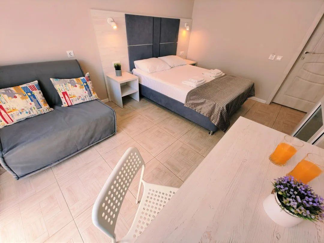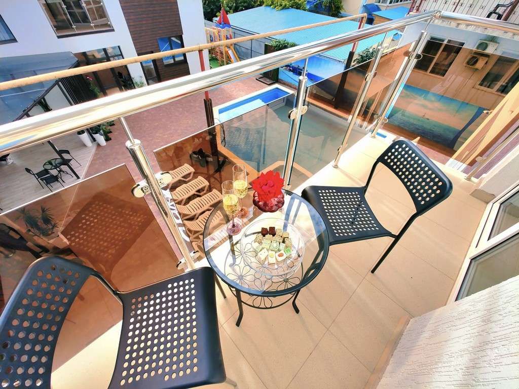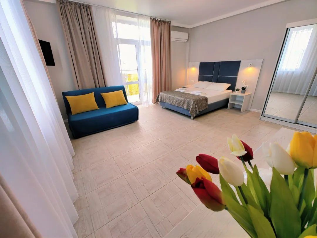 Номера 4-х «стандарт» (двуспальная кровать, диван-кровать, тумбочки, журнальный стол, шкаф для одежды, кондиционер, телевизор, холодильник, душ, санузел, холодная и горячая вода круглосуточно, балкон с мебелью).