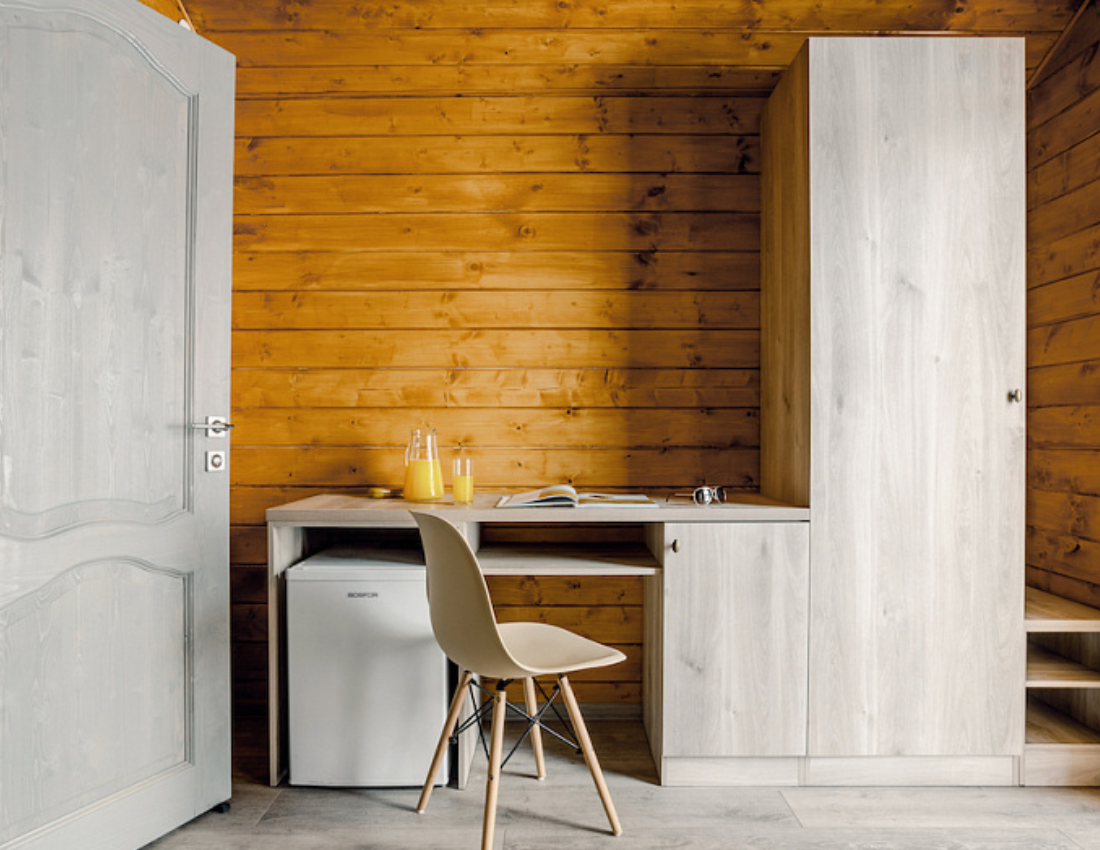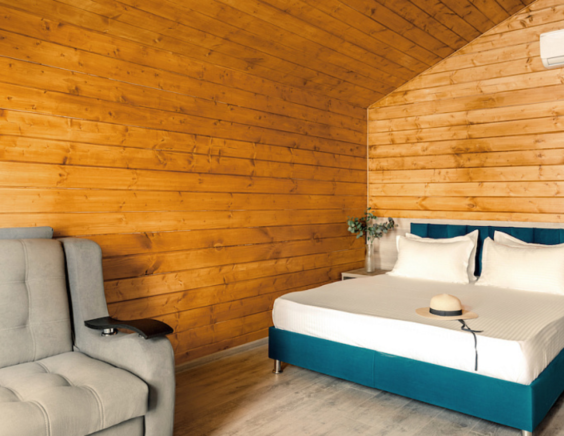 В новых домиках-бунгало, рассчитанных на проживание до 4-х человек- двуспальная кровать и раскладной диван. Домики со всеми удобствами (душ, умывальник, туалет), телевизор, холодильник, кондиционер, Wi-Fi.