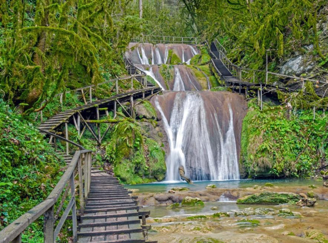 Далее вы садитесь на машины «Газ-66», которые провозят вас по реке Шахе к каскаду водопадов. 12 из 33 водопадов оборудованы деревянными настилами и перилами, по которым вы сможете погулять и полюбоваться красотами колхидского леса. Желающие могут поплавать в купальных чашах, которые образовывает падающая вода. Это удивительное творение природы подарит множество незабываемых впечатлении.