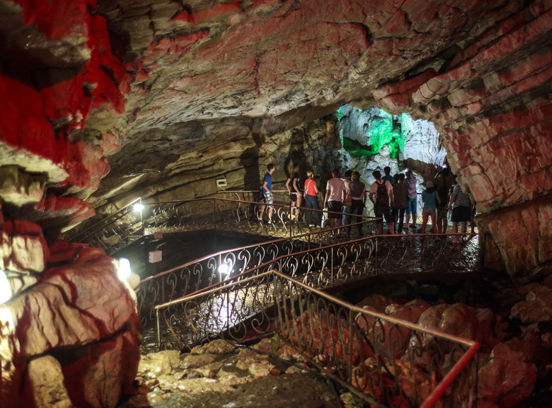 После остановки автобуса вы прогуляетесь пешком по тропе национального парка, полюбуетесь зарослями колхидского леса и потрясающими видами на окрестности. Миновав грабовый и буковый лес, спустившись по мощным известковым плитам, вы окажитесь у входа в пещеру! Оттуда веет прохладой и таинственностью. Вам предстоит пройти примерно 600 метров – это несколько залов, каждый красив и интересен по-своему (маршрут оборудован лестницами, перилами, есть подсветка).
