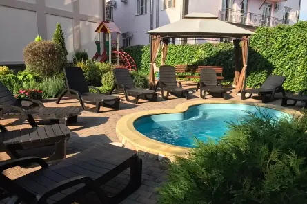 На территории – уютная зона для отдыха, беседка, мангальная зона, для детей - детская площадка, бассейн, качели, батут, мини-автомобили. Доступен Wi-Fi интернет.