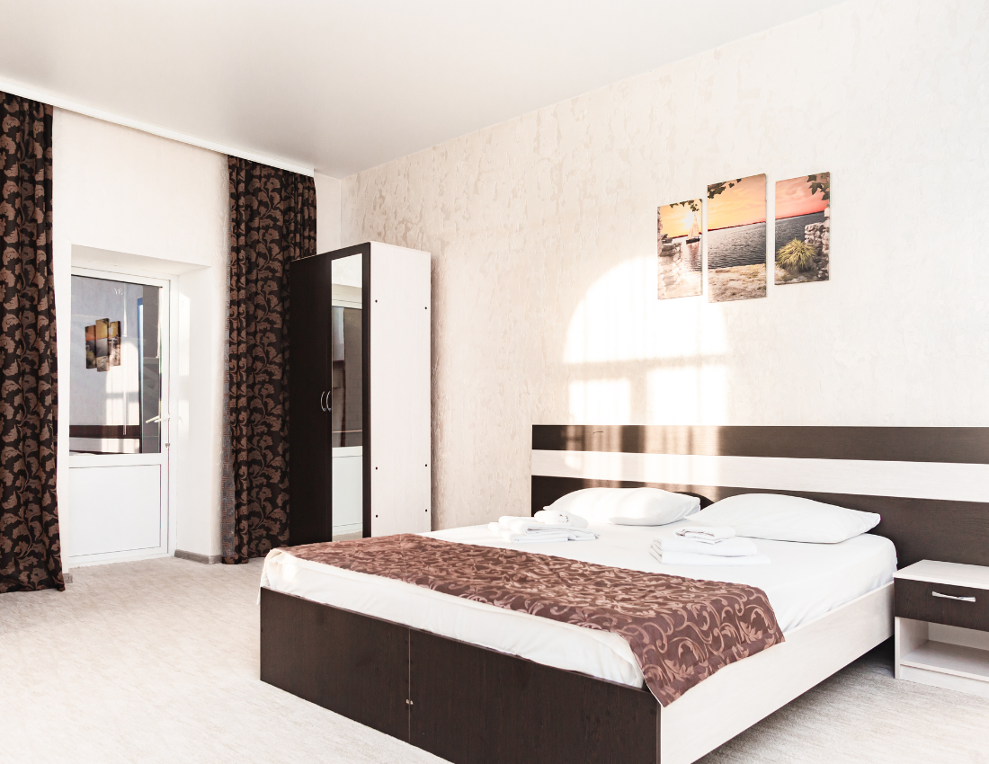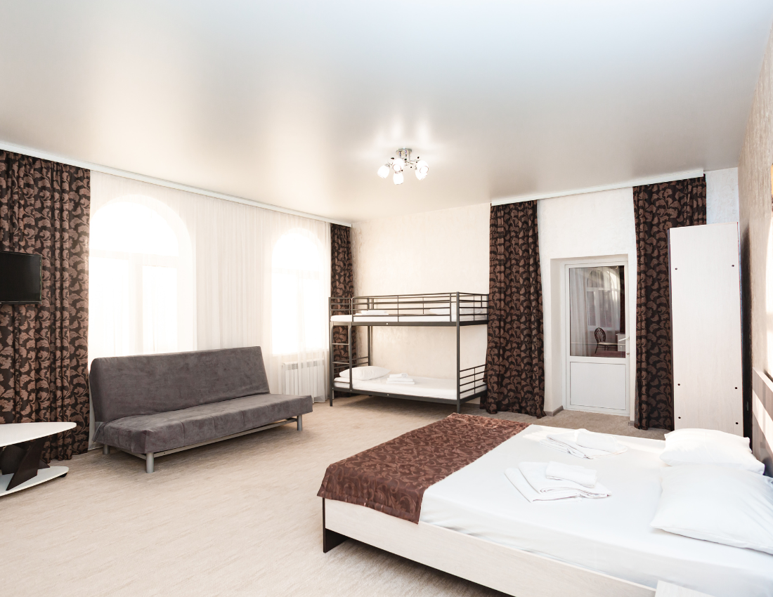 Дополнительные места (еврораскладушка) предоставляются только в 2-х местных номерах и двухкомнатных, а детская кроватка (по запросу) в любой номер.