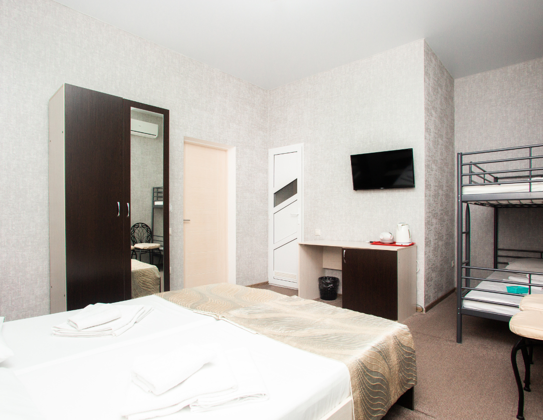 Номера 3-х и 4-х местные однокомнатные имеют две кровати ( при необходимости соединяемые в двуспальную), и удобную широкую двухъярусную кровать.